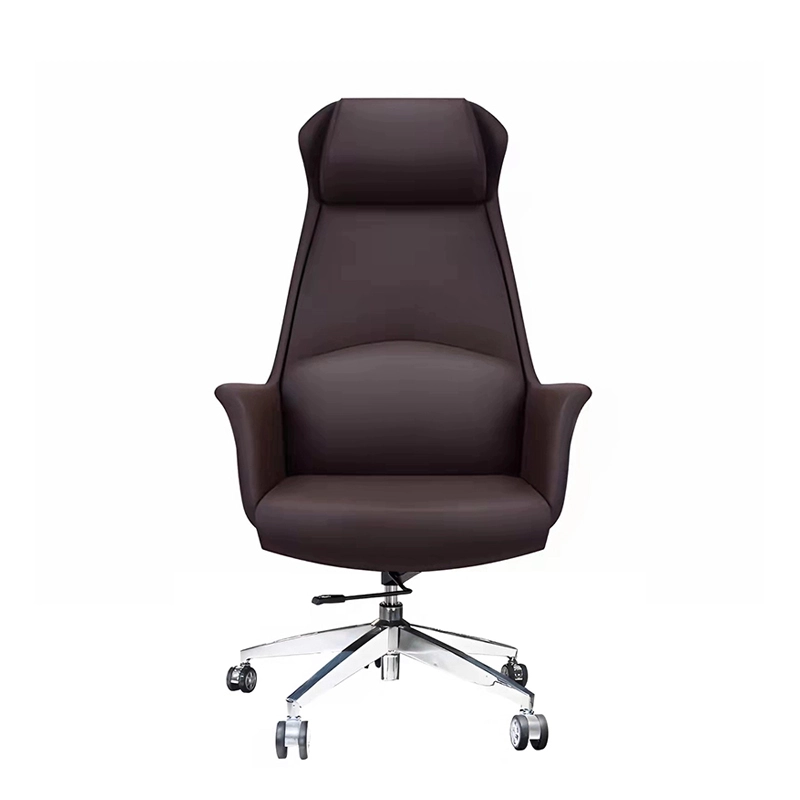 This executive chair presents an elegant chocolate brown tone with a curved high-back ergonomic design, crafted from genuine leather and a robust aluminum frame. Combining ergonomic engineering with height adjustment and superior support, it delivers all-day comfort and reliable performance for senior management, balancing a professional presence with modern comfort.