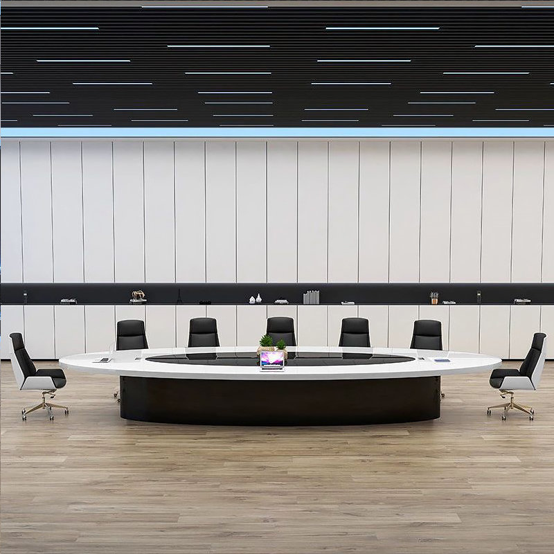 - Form and Presence: A generous oval top (customizable dimensions — typically 4200–6000 mm long) creates an uninterrupted visual flow that facilitates eye contact and equitable participation for board members. The curved silhouette softens acoustics and elevates room aesthetics.