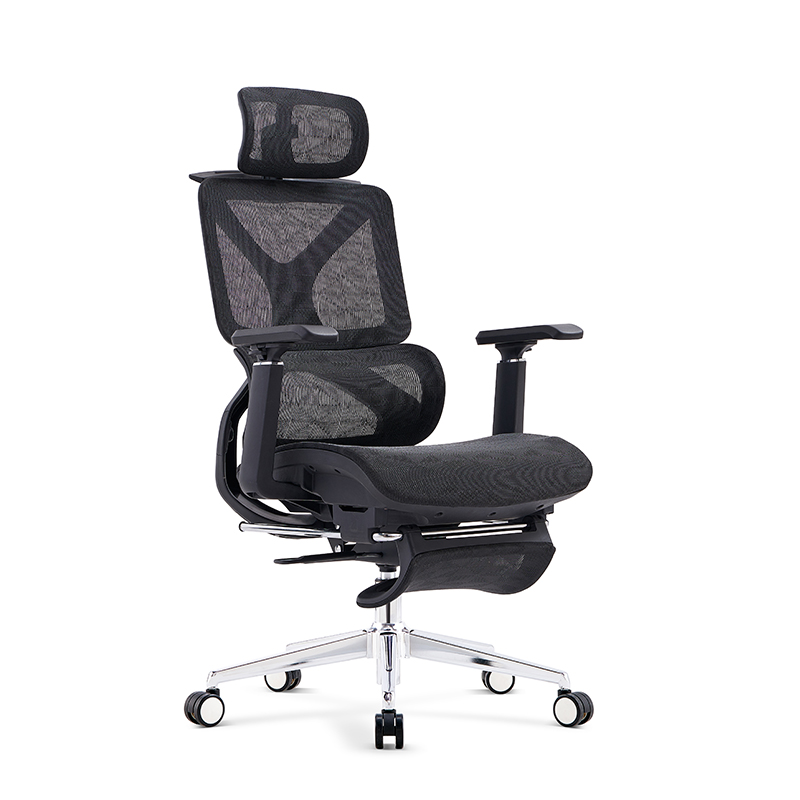 The chair features breathable mesh upholstery for optimal airflow, paired with adjustable lumbar support to reduce lower-back pressure. 4D adjustable armrests provide precise positioning for arms and shoulders, while the retractable footrest allows users to relax during breaks or reclined seating. A reinforced aluminum alloy base ensures long-term stability and high load capacity, making this chair ideal for premium office environments.