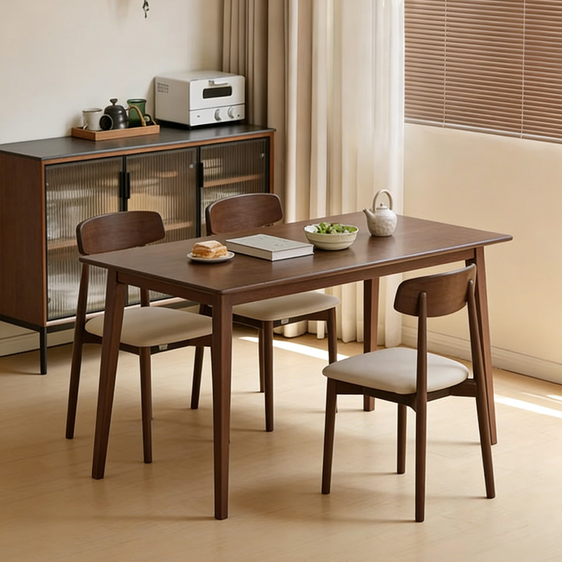 Crafted from rubberwood with oak and walnut finishes, this dining set is designed for homes, cafés, and restaurants. It blends modern aesthetics, durability, and comfortable seating for everyday dining, aiming to create a warm and stylish atmosphere.