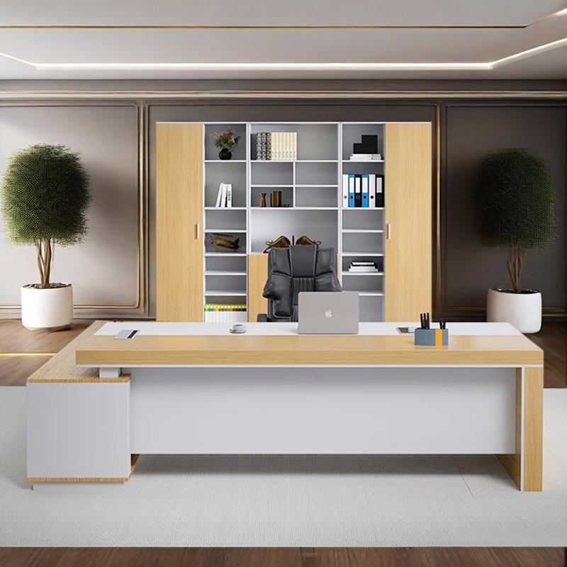 Elevate your leadership presence with this streamlined manager desk featuring a warm light wood surface, integrated side cabinet, and convenient open shelving. Combining professional sophistication with practical storage, it meets the demands of today's dynamic office environment with understated elegance.