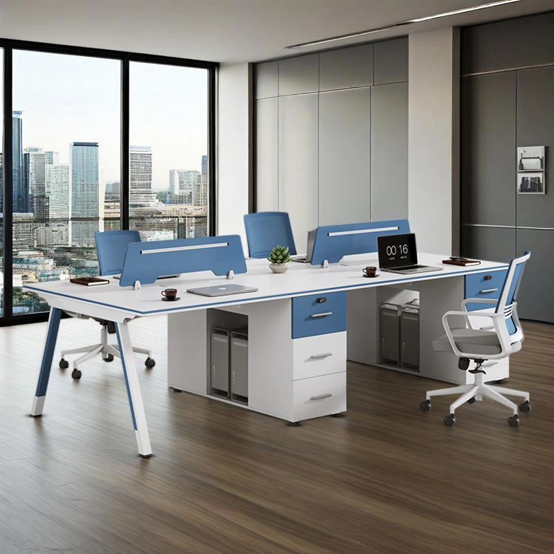 Designed for collaboration-focused modern offices, this four-person L-shaped workstation uses modular desk panels and integrated partitions to create semi-open zones that support team interaction while preserving individual focus within an L-shaped layout. It is particularly suited for workspaces seeking to balance organized collaboration with efficient use of open-plan areas.