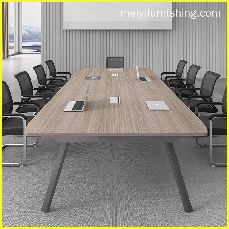 The meeting table tabletop and baffle are 50MMT melamine board, the table foot is metal,and the conference table leg thickness is 2.0mm , the bottom of the tabletop and the table foot are brushed metal edging, and the tabletop is equipped with a double-layer aluminum wire box
